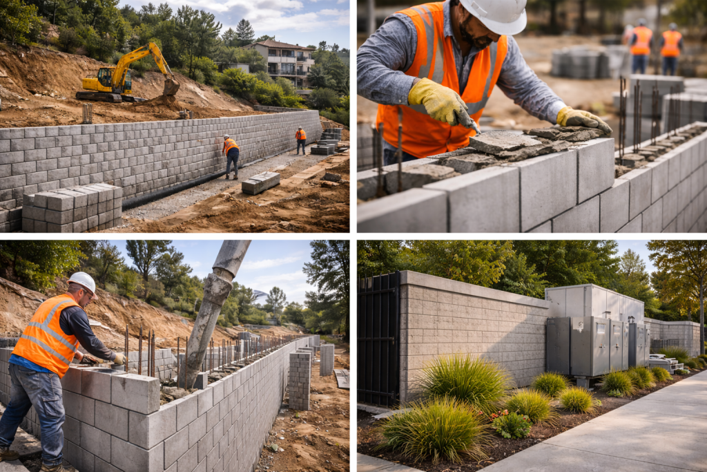 CMU walls are commonly used for property lines and privacy, commercial site control, trash and equipment enclosures, retaining-style site transitions (when designed appropriately), and structural applications where durability and fire resistance matter.